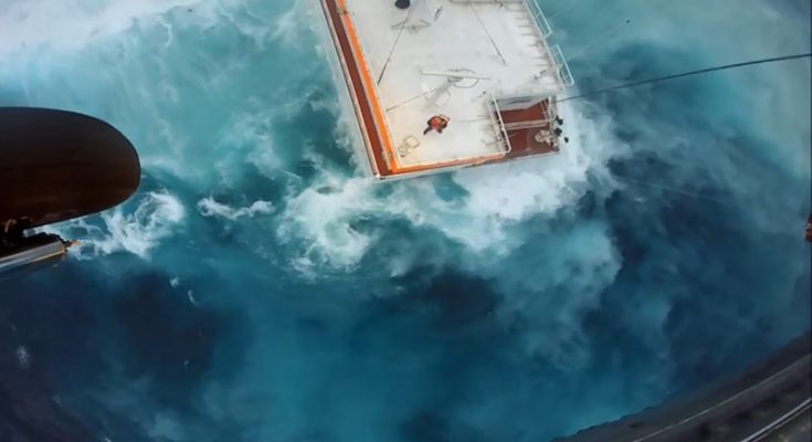 Μόνο η γέφυρα του πλοίου έχει μείνει έξω από το νερό, ενώ τεράστια κύματα απειλούν να το βουλιάξουν εντελώς – Οι ναυτικοί, φορώντας σωσίβια, προσπαθούν να σωθούν, ενώ το ελικόπτερο του ΠΝ τους τραβάει στον αέρα – Βροχή και άνεμοι 7 Μποφόρ δυσκόλεψαν την διάσωση