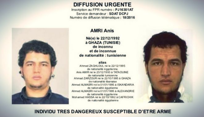 Ο 24χρονος Τυνήσιος Ανις Αμρί ταυτοποιήθηκε ως ο ύποπτος για εμπλοκή στο τρομοκρατικό χτύπημα με φορτηγό στο Βερολίνο, ανακοίνωσε το γραφείο της ομοσπονδιακής εισαγγελίας στη Γερμανία, επικηρύσσοντάς τον για 100.000 ευρώ. Ο Ανις Αμρί έχει ύψος 1,78, ζυγίζει 75 κιλά, έχει μαύρα μάτια και φορά μαύρα γυαλιά, όπως ανέφερε ο εισαγγελέας στην ανακοίνωση του.