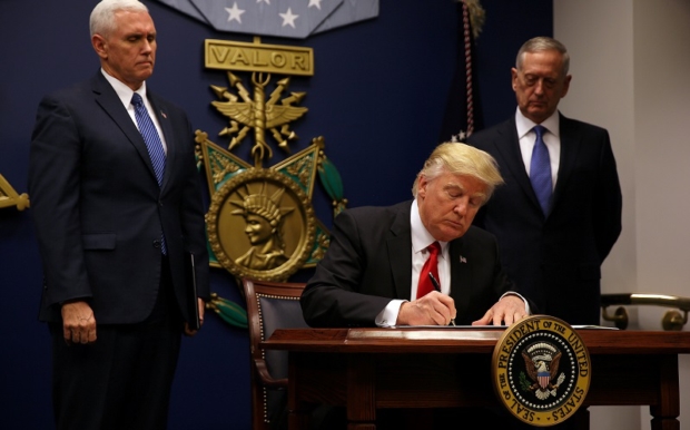 «Θέτω σε εφαρμογή νέα μέτρα ελέγχου για να μείνουν εκτός των Ηνωμένων Πολιτειών της Αμερικής οι ριζοσπάστες ισλαμιστές τρομοκράτες. Δεν τους θέλουμε εδώ», ήταν η δήλωση του Τραμπ μόλις έβαλε την υπογραφή στο αμφιλεγόμενο διάταγμα. Η υπογραφή του διατάγματος έγινε κατά τη διάρκεια μιας επίσημης τελετής στο Πεντάγωνο για την ανάληψη των καθηκόντων του νέου υπουργού Άμυνας Τζέιμς Μάτις.  «Θέλουμε να υποδεχόμαστε στη χώρα μας μόνον όσους θα την υποστηρίξουν και αγαπούν βαθιά τον λαό μας», πρόσθεσε.