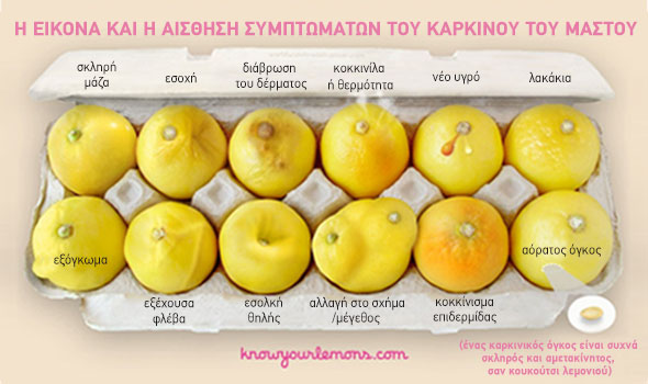 Αν δεν είχα δει αυτή την εικόνα, δεν θα ήξερα τι να προσέξω. Κάντε μια χάρη σε εμάς που κινδυνεύει η ζωή μας και μην παίζετε με καρδούλες –αρχίστε να βοηθάτε πραγματικά. Απαιτείται περισσότερη έρευνα για θεραπεία του μεταστατικού καρκίνου του μαστού και πραγματική επαγρύπνηση.» Η εικόνα αυτή που δημιουργήθηκε στο πλαίσιο της καμπάνιας Know Your Lemons είναι εξαιρετικά ενημερωτική και θα πρέπει να ληφθεί υπ’όψιν τόσο από γυναίκες όσο και από άντρες. «Αν θέλετε πραγματικά να βοηθήσετε ανθρώπους ΜΕ καρκίνο ή που ΘΑ νοσήσουν με καρκίνο, αντί να κοινοποιείτε καρδούλες, κοινοποιήστε εικόνες όπως αυτή», καταλήγει η Erin στην ανάρτηση της, το οποίο έχει λάβει μέχρι στιγμής 30 χιλιάδες κοινοποιήσεις.