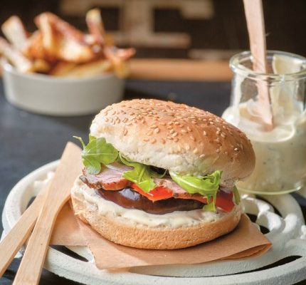 Μπέργκερ με κρητικό απάκι, μελιτζάνα, πιπεριά και σάλτσα εστραγκόν