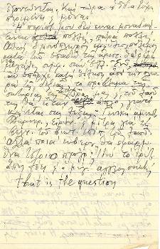 Η σελίδα των σημειώσεων για την τελευταία επιστολή του Μπελογιάννη πριν την εκτέλεσή του, που καταλήγει με τη φράση του Σαίξπηρ «that is the question»