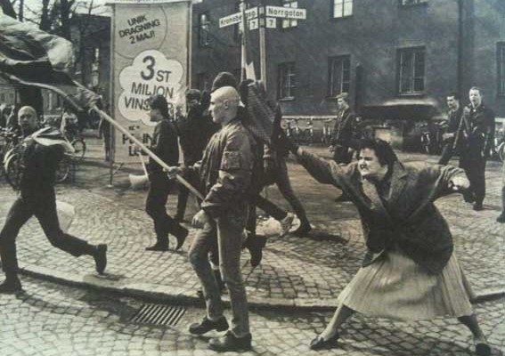 Σουηδέζα επιτίθεται σε νεοναζί διαδηλωτή με την τσάντα της. Η γυναίκα αυτή ήταν επιζήσασα από στρατόπεδο συγκέντρωσης (1985).