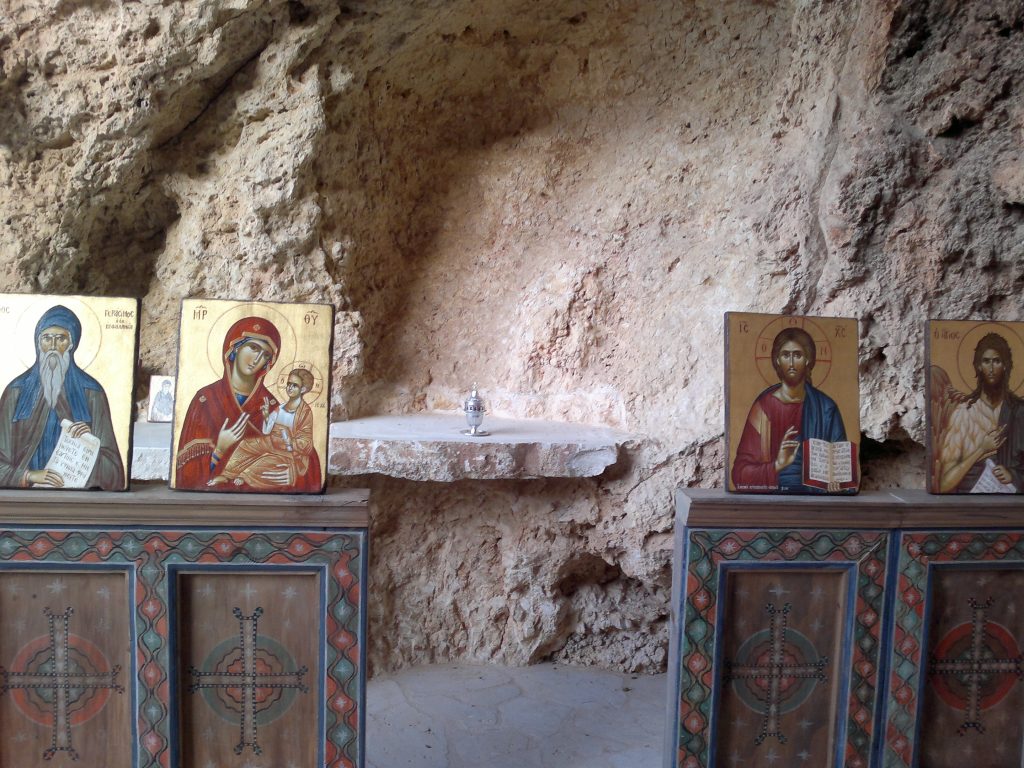 Δεξιά και αριστερά σ’ αυτήν την κάθοδο βρίσκονταν σπηλαιώδη παρεκκλήσια, σκήτες των μοναχών που είχαν ζήσει εκεί, τα οποία τιμώνται στον Άγιο Αντώνιο, στους Αγίους Επτά Παίδες, στον Άγιο Σιλουανό τον Αθωνίτη και στους Αγίους Νεομάρτυρες της Κρήτης. Γινόταν στάση σε καθένα απ’ αυτά και προσκύνημα, ώσπου καταλήξαμε μέσα από ένα καλντερίμι στην Αγία Κυριακή.