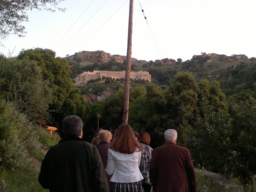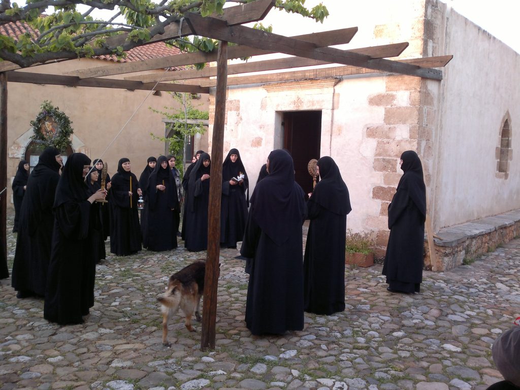 Βρεθήκαμε στο Μοναστήρι ανήμερα του Πάσχα, το απόγευμα, για τη δεύτερη Ανάσταση. Η διαδρομή ως εκεί μαγευτική και το Μοναστήρι πάνω στο βράχο επιβλητικό. Γαλήνη επικρατούσε παντού και όσοι πιστοί παρευρέθηκαν εκεί , φάνηκαν ότι γνώριζαν να σέβονται τη σιωπή των μοναχών. Το Μοναστήρι έχει τους δικούς του κανόνες και το δικό του τρόπο επικοινωνίας με τον έξω κόσμο και εκείνη τη μέρα ήταν φανερό ότι γινόταν ένα αναστάσιμο άνοιγμα προς όλους.