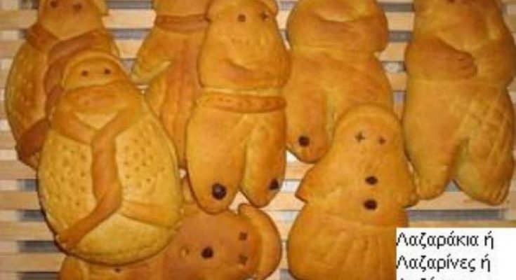 Για την ψυχή του Λάζαρου οι γυναίκες ζύμωναν ανήμερα το πρωί ειδικά κουλούρια, τους «λαζάρηδες», τα «λαζαρούδια» ή και «λαζαράκια» λέγοντας «Λάζαρο δεν πλάσεις, ψωμί δεν θα χορτάσεις» αφού σύμφωνα με τις δοξασίες ο Λάζαρος είχε παραγγείλει πως «Όποιος ζυμώσει και δε με πλάσει, το φαρμάκι μου να πάρει…» Στα «λαζαράκια» έδιναν το σχήμα ανθρώπου σπαργανωμένου, όπως ακριβώς παριστάνεται ο Λάζαρος στις εικόνες. Όσα παιδιά είχε η οικογένεια τόσους «λαζάρηδες» έπλαθαν και στη θέση των ματιών έβαζαν δυο γαρίφαλα.