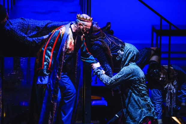 Η φωνή του βαρύτονου, στον ρόλο του Ρήγα, έρχεται ως ένα στοιχείο ευθείας εξουσίας ανάμεσα στις «καμπύλες» των άλλων φωνών. Οκτώ άνδρες τραγουδιστές (από το δυναμικό της Λυρικής) συνθέτουν το φωνητικό σύνολο που εναλλάσσει ρόλους αυλικών, στρατιωτών, αλλά και αφηγητή-σχολιαστή κατά το πρότυπο του χορού στις αρχαίες τραγωδίες. Δεν υπάρχει πρόζα παρά μόνον διαρκής ροή μουσικής επί δύο ώρες χωρίς διάλειμμα. Υπήρχε η πρόκληση να συνδεθούν οι σκηνές χωρίς χάσματα, με μουσική που να ταιριάζει στις φωνές, με αποτέλεσμα που να κρατάει τον θεατή. Ο Δημήτρης Μαραμής δημιούργησε διαλόγους, ανασύνθεσε σκηνές, καθώς ζητούμενο ήταν η νοηματική ροή.