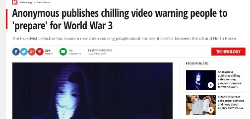 Στο βίντεο που ανέβασαν στον λογαριασμό τους στο YouTube οι Anonymous, υπό τον τίτλο «They are preparing for what comes next… (WW3 2017-2018)», ένας άνδρας που φορά μαύρο μανδύα και τη μάσκα του Guy Fawkes εξηγεί πώς οι ενέργειες των ΗΠΑ, της Κίνας και της Ιαπωνίας, που συμμετέχουν στις εντάσεις μεταξύ Βόρειας Κορέας και Νότιας Κορέας, υποδηλώνουν ότι ένας πόλεμος τεραστίων διαστάσεων είναι ορατός στον ορίζοντα.