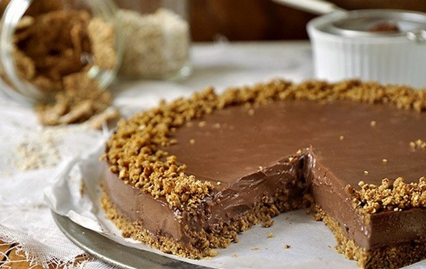 5. Απλώνουμε τη κρέμα σοκολάτας πάνω στη βάση και βάζουμε την τούρτα στο ψυγείο τουλάχιστον για δύο ώρες για να σφίξει και να σταθεροποιηθεί.