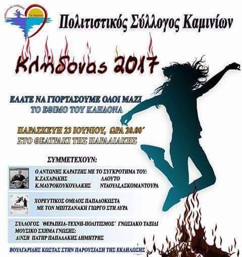 Την γιορτή του “Κλήδονα” θα γιορτάσει ο Πολιτιστικός Σύλλογος Καμινίων, την Παρασκευή 23 Ιουνίου, στο Μικρό Θεατράκι του Καράβολα στη Παραλιακή Ηρακλείου.
