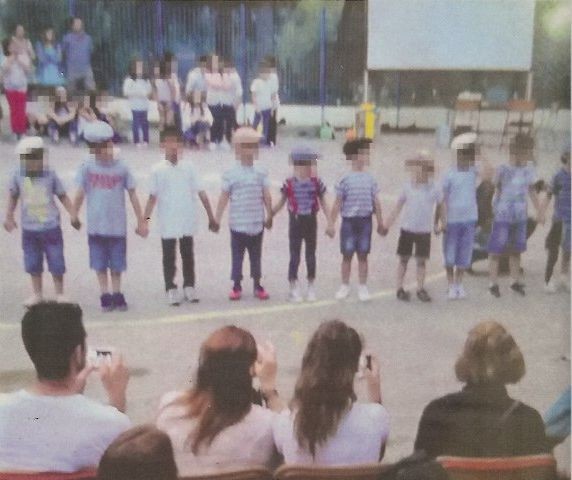 Σε φωτογραφία από τη γιορτή που δημοσιεύει η Real News τα παιδιά της Δ’ τάξης αποχαιρετούν τη σχολική χρονιά. Τη φωτογραφία τράβηξε γονέας και έχει απαθανατίσει τη στιγμή που οι μαθητές χαιρετούν τους θεατές τους. Κανονικά μετά από ελάχιστα λεπτά ο Μάριος και οι συμμαθητές του της Ε’ τάξης θα έπαιρναν σειρά για το δικό τους κομμάτι στην παράσταση.