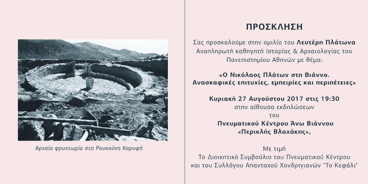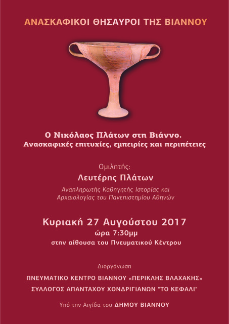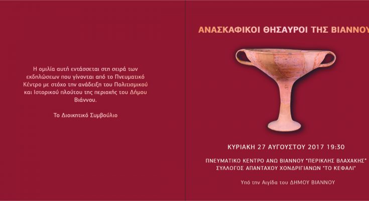 Δεν είναι πρώτη φορά που το Πνευματικό Κέντρο «Περικλής Βλαχάκης» αναδεικνύει τον αρχαιολογικό πλούτο της ευρύτερης περιοχής της Βιάννου. Τον Μάιο του 2016 με αφορμή διάλεξη που διοργανώθηκε, άνοιξε για πρώτη φορά μετά από τριάντα χρόνια ο αρχαιολογικός χώρος ενός από τα αρχαιότερα ιερά της Κρήτης, αυτό του Ερμή και της Αφροδίτης στη Σύμη Βιάννου. Με αυτές τις προσπάθειες το Πνευματικό Κέντρο φιλοδοξεί να παρέχονται εξαιρετικές ευκαιρίες στους νέους να γνωρίσουν το σπουδαίο πολιτισμό και τη σημαντική ιστορία που αναπτύχθηκε στην περιοχή της Βιάννου και να δίνονται ερεθίσματα να ασχοληθούν με τη μελέτη τους.