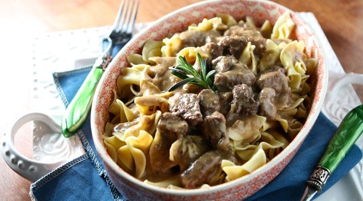 Πρόκειται για το «μοσχάρι στρογκανόφ», ένα πιάτο με βάση το μοσχάρι, τα κρεμμύδια και τα μανιτάρια, τα οποία μαγειρεύονται σε μία κρεμώδη σάλτσα και συνοδεύεται είτε από ζυμαρικά είτε από πατάτες.