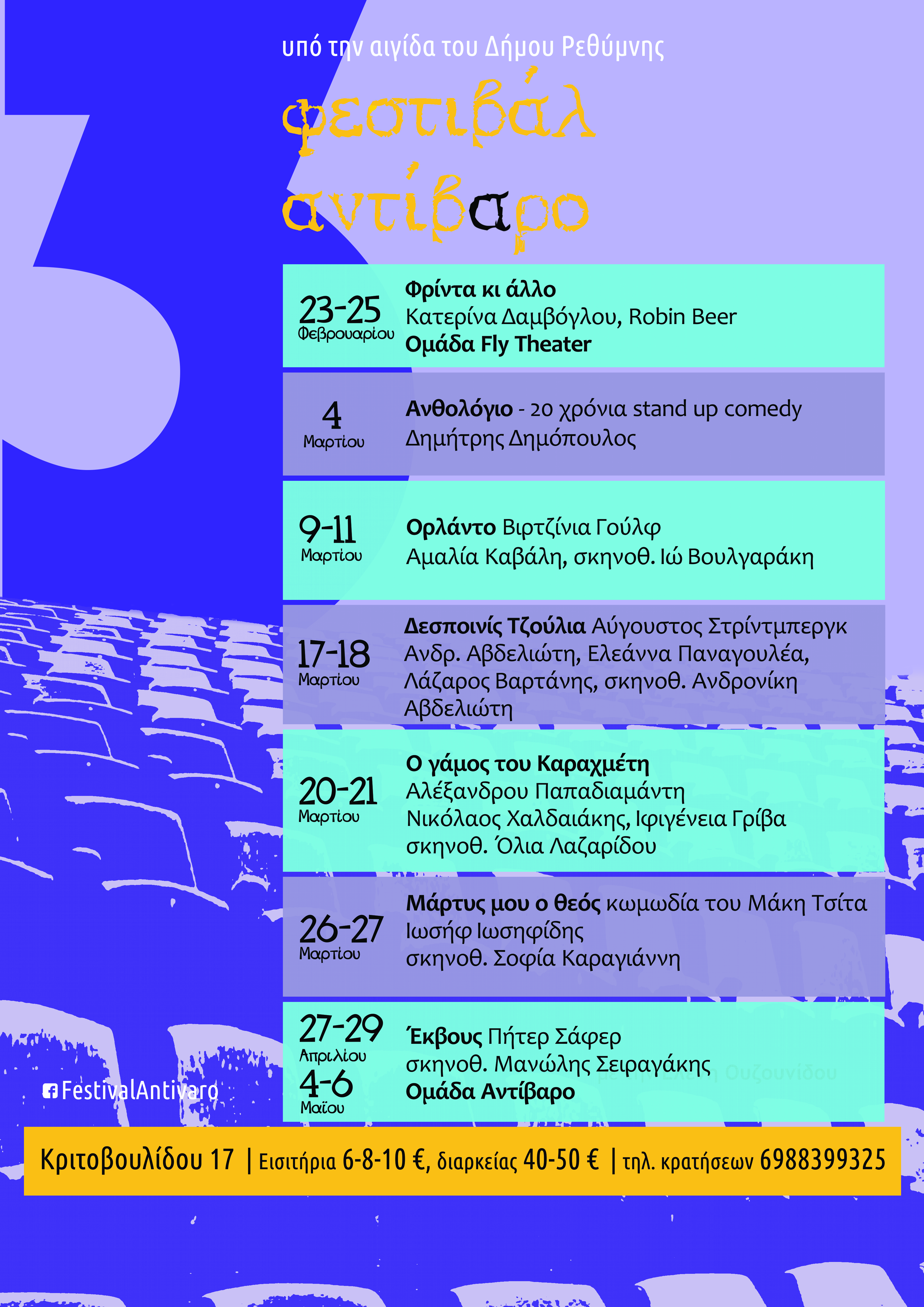 Όλες οι παραστάσεις θα πραγματοποιηθούν στο Κέντρο Λαϊκής Τέχνης, Κριτοβουλίδου 15-17, Ρέθυμνο, ώρα 21:00.