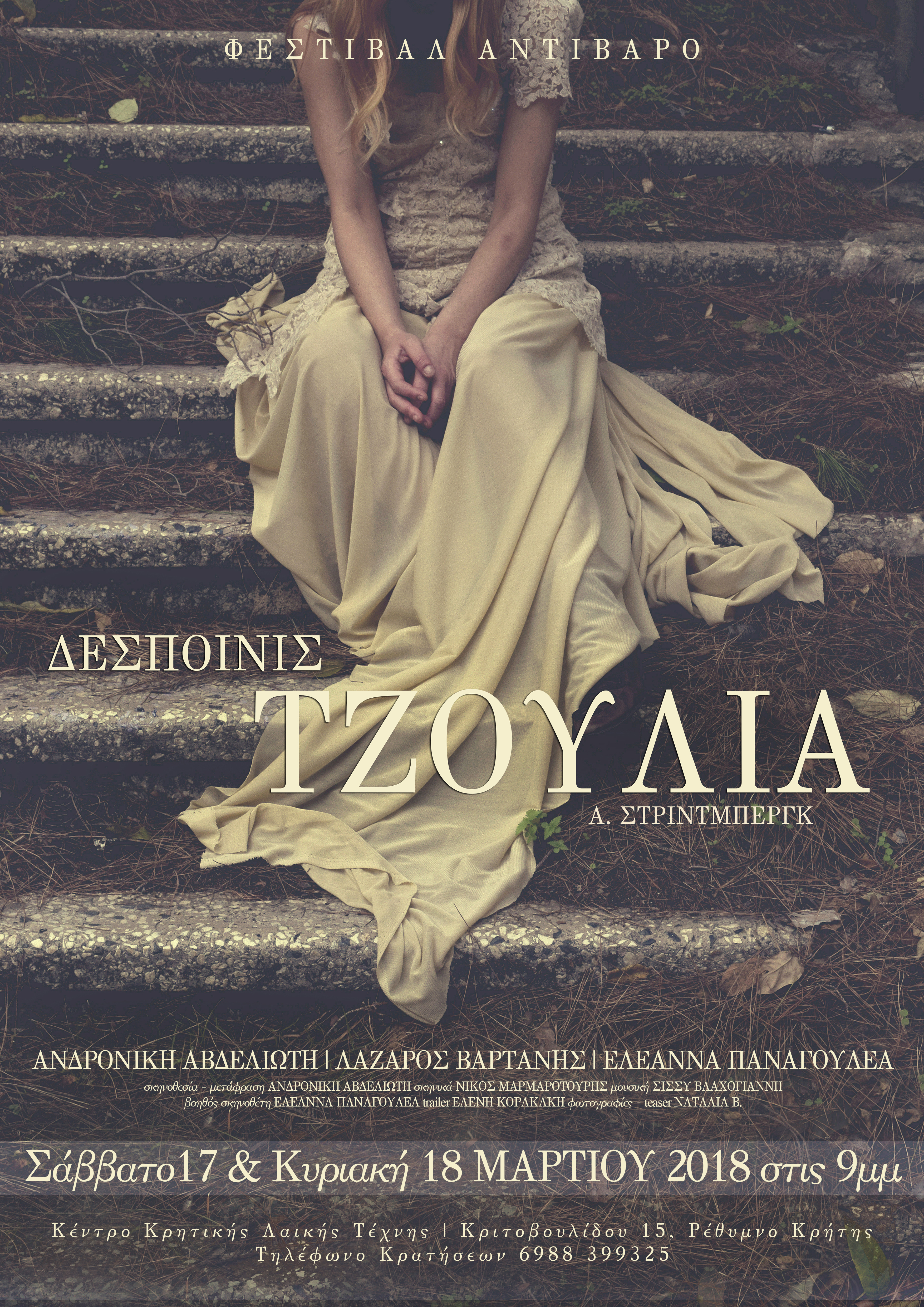 Στις 17 και 18 Μαρτίου, έχει σειρά η Δεσποινίς Τζούλια του Α. Στρίντμπεργκ, σε σκηνοθεσία της Ανδρονίκης Αβδελιώτη και με πρωταγωνιστές την ίδια, την Ελεάννα Παναγουλέα και τον Λάζαρο Βαρτάνη. Τρεις άνθρωποι, πρωταγωνιστές της δικής τους «τραγωδίας», ορίζουν τον τρόπο ζωής τους μέσα από αυστηρούς κανόνες και καθορισμένες συμπεριφορές, πάντα σε συνάρτηση με την τάξη και το φύλο, τις κοινωνικές συνθήκες και τις προκαταλήψεις, που, ακόμα και σήμερα εξακολουθούν να υπαγορεύουν, να εγκλωβίζουν και να βασανίζουν.