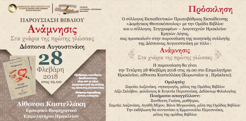 Η παρουσίαση της ποιητικής συλλογής της Δέσποινας Αυγουστινάκη με τίτλο «Ανάμνησις– Στα χνάρια της πρώτης γλώσσας» θα γίνει την Τετάρτη 28 Φεβρουαρίου στις 7 το απόγευμα στο Επιμελητήριο Ηρακλείου, αίθουσα Καστελλάκη ( Κορωναίου 9, Ηράκλειο).
