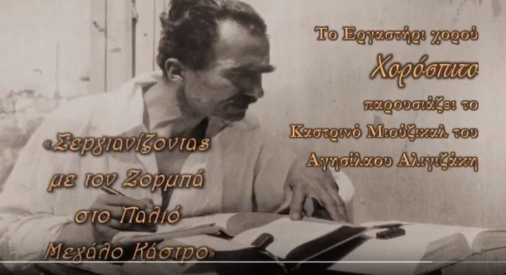 Πρόκειται για τη μουσικοθεατρική παράσταση που παρουσιάζει το Εργαστήρι Χορού »Χορόσπιτο» βασισμένη στο θεατρικό έργο του πολιτισμιολόγου Αγησίλαου Αλιγιζάκη »Σεργιανίζοντας με το Ζορμπά στο Παλιό Μεγάλο Κάστρο».