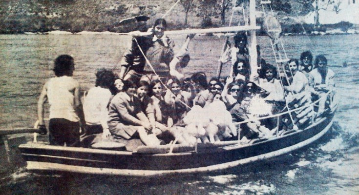 Μόλις η βάρκα βγήκε από τον απάνεμο όρμο κι άρχισε το ταρακούνημα των κυμάτων, τα κορίτσια, που σημειωτέον τα περισσότερα δεν γνώριζαν κολύμπι, άρχιζαν να τρομάζουν και να πανικοβάλλονται, οπότε μέσα στην τρομάρα τους και με κάποιο δυνατό κύμα, μαζεύτηκαν στη μιά μεριά της βάρκας και…. μπλουμ! πάρ’ τες όλες στο νερό, με τη βάρκα τούμπα!