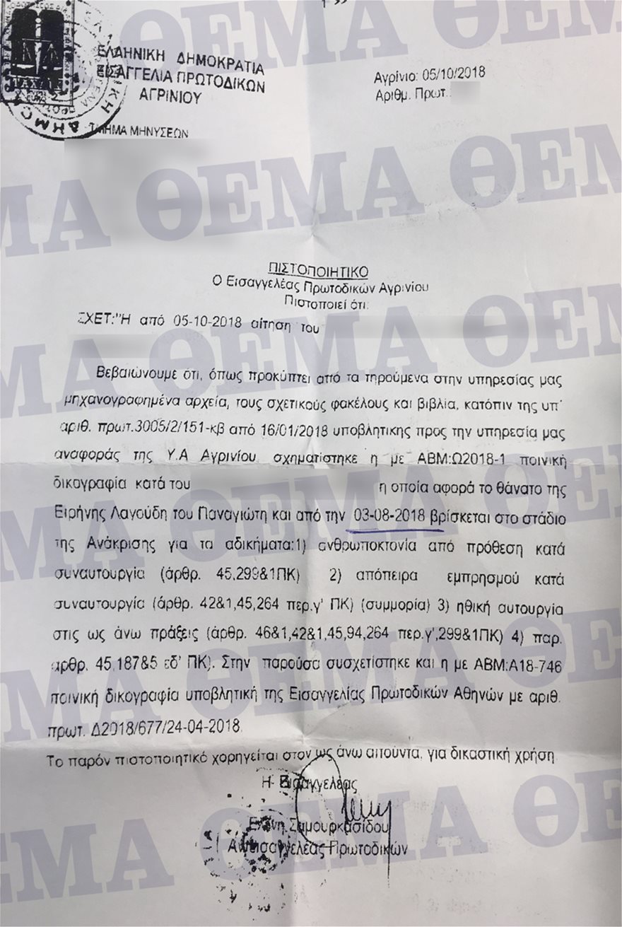 Ωστόσο, έγγραφο που φέρνει στη δημοσιότητα το protothema.gr, αποδεικνύει την εξελισσόμενη ποινική διαδικασία σε βάρος του συγκεκριμένου προσώπου. Ειδικότερα, σύμφωνα με πιστοποιητικό του Εισαγγελέα Πρωτοδικών Αγρινίου, βεβαιώνεται ότι η ποινική διαδικασία σε βάρος του γιατρού – το όνομα του οποίου αναφέρεται στο έγγραφο- αφορά τα αδικήματα της ανθρωποκτονίας από πρόθεση κατά συναυτουργία, απόπειρα εμπρησμού κατά συναυτουργία (συμμορία) και ηθική αυτουργία στις παραπάνω πράξεις. Σύμφωνα με ασφαλείς πληροφορίες μάλιστα, τις επόμενες ημέρες ο γιατρός θα κληθεί για εξηγήσεις στο πλαίσιο της εξελισσόμενης διαδικασίας σε βάρος του.